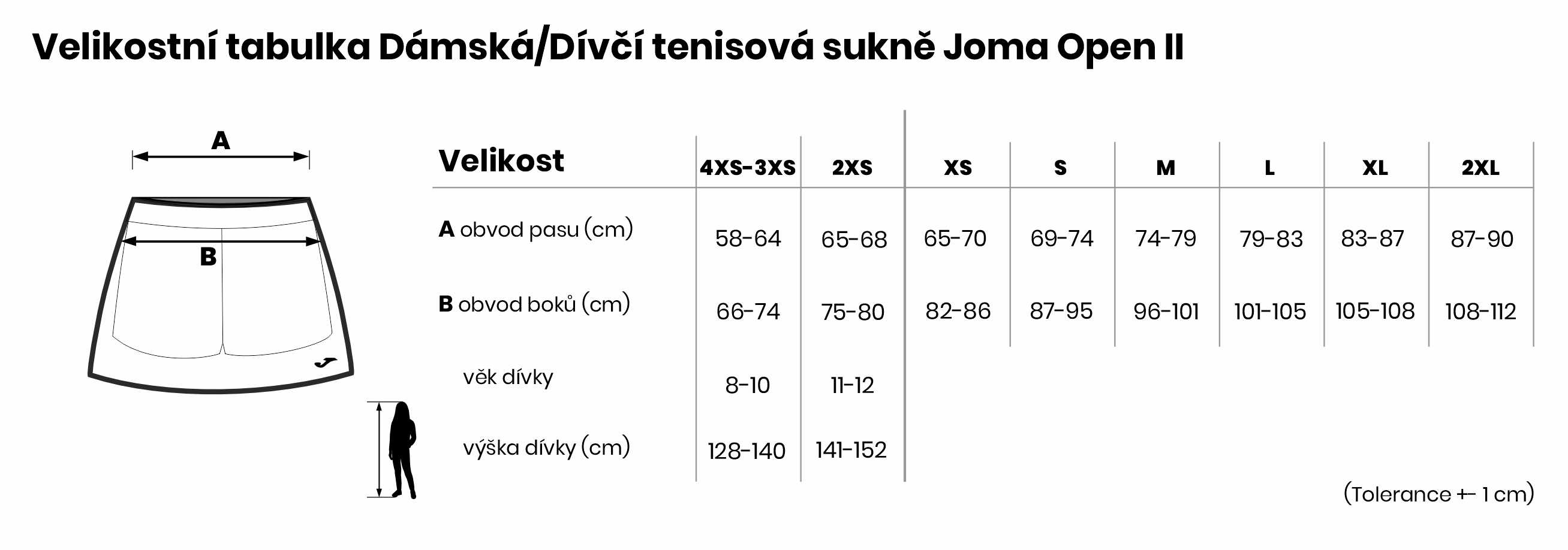 Velikostní tabulka Dámská/Dívčí tenisová sukně Joma Open II